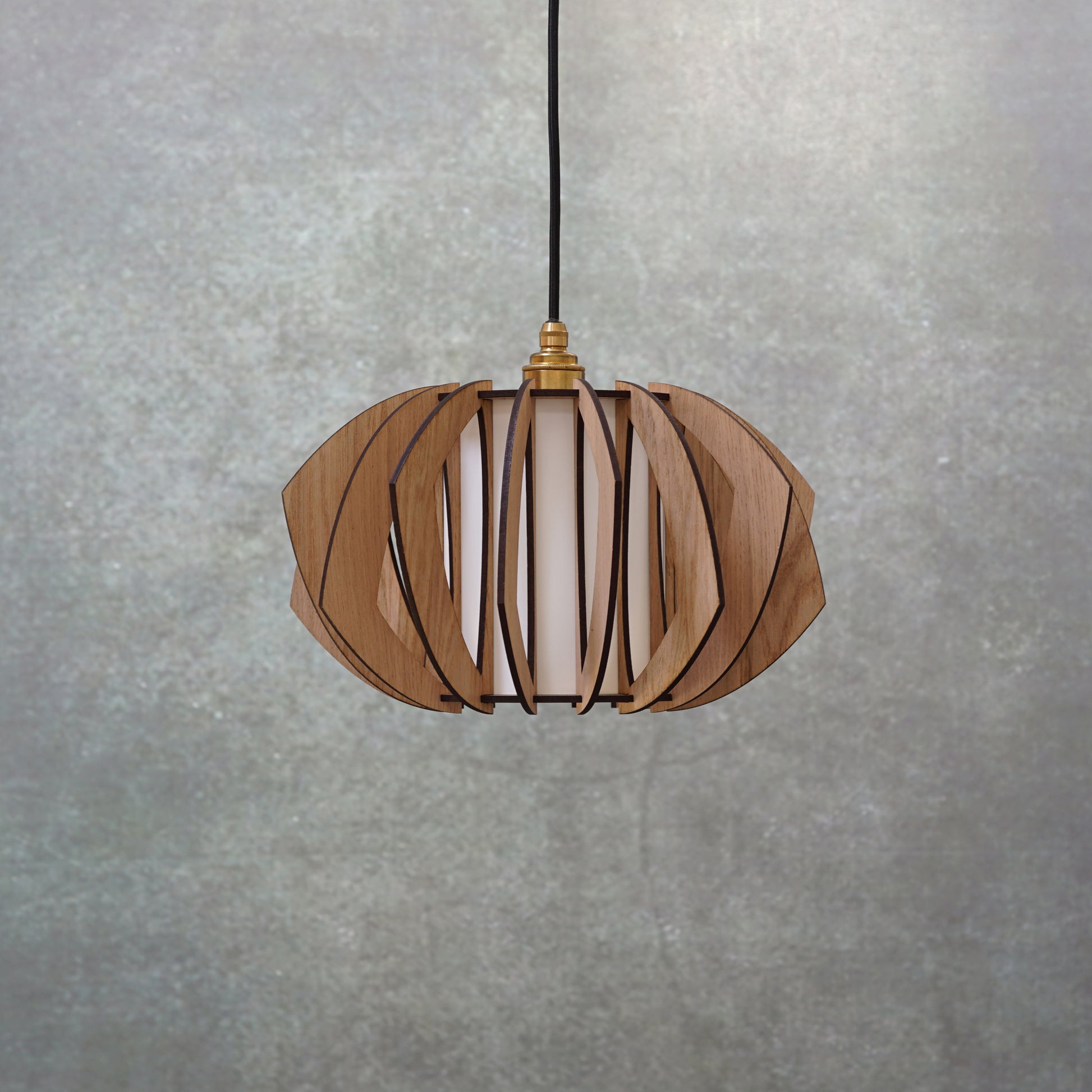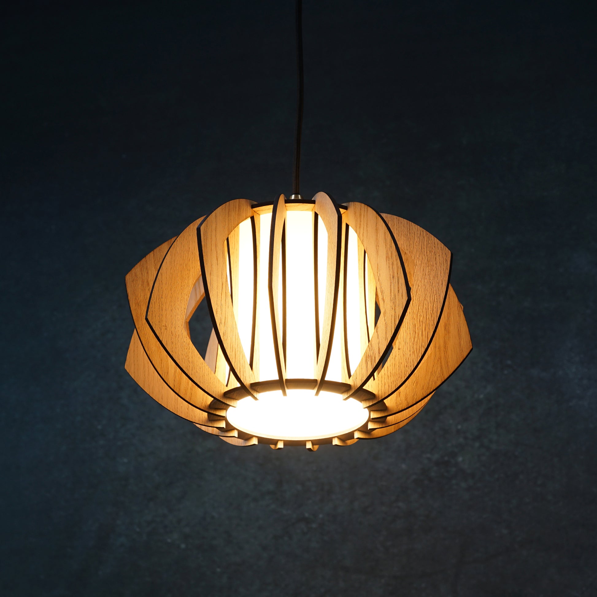 Looking across the landscape you can see hills overlapping and crossing over each other from summit to valley, creating a layering effect from which we draw our design. The broken symmetry casts shadows and plays with the light against the wood surface, creating a lampshade that is a signature piece wherever it is placed.